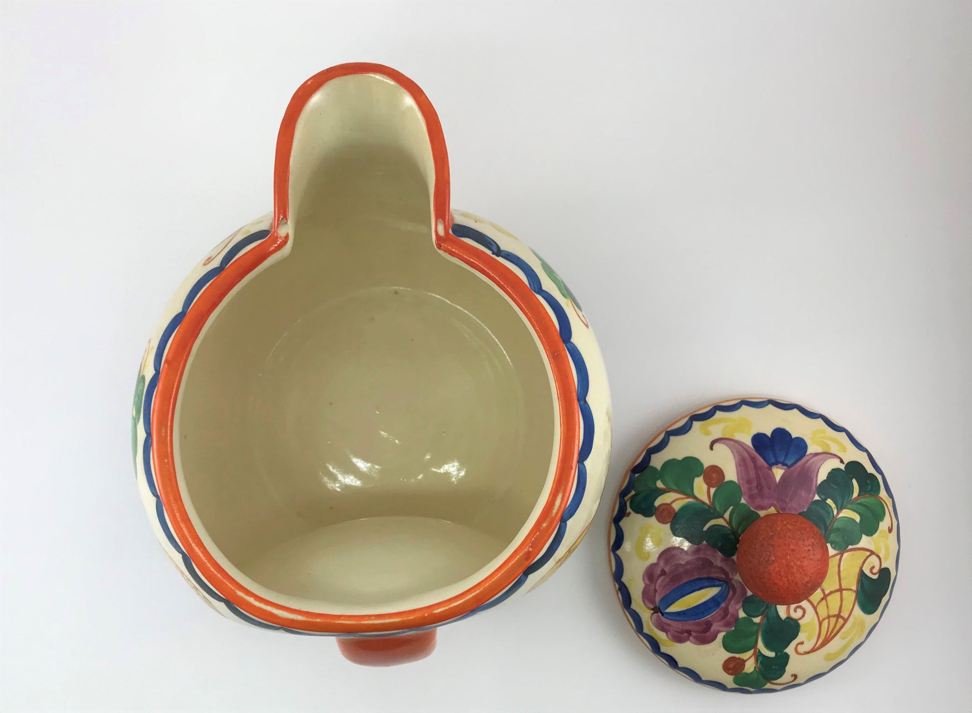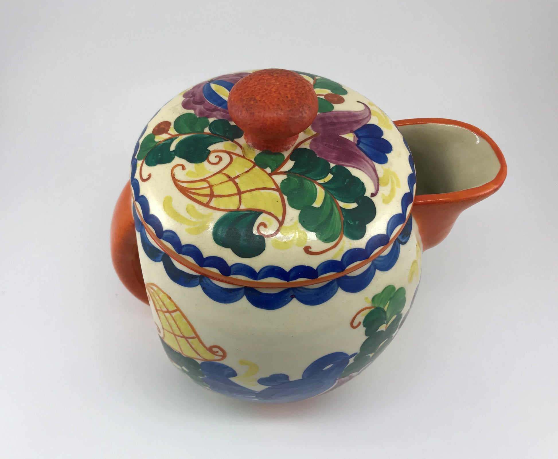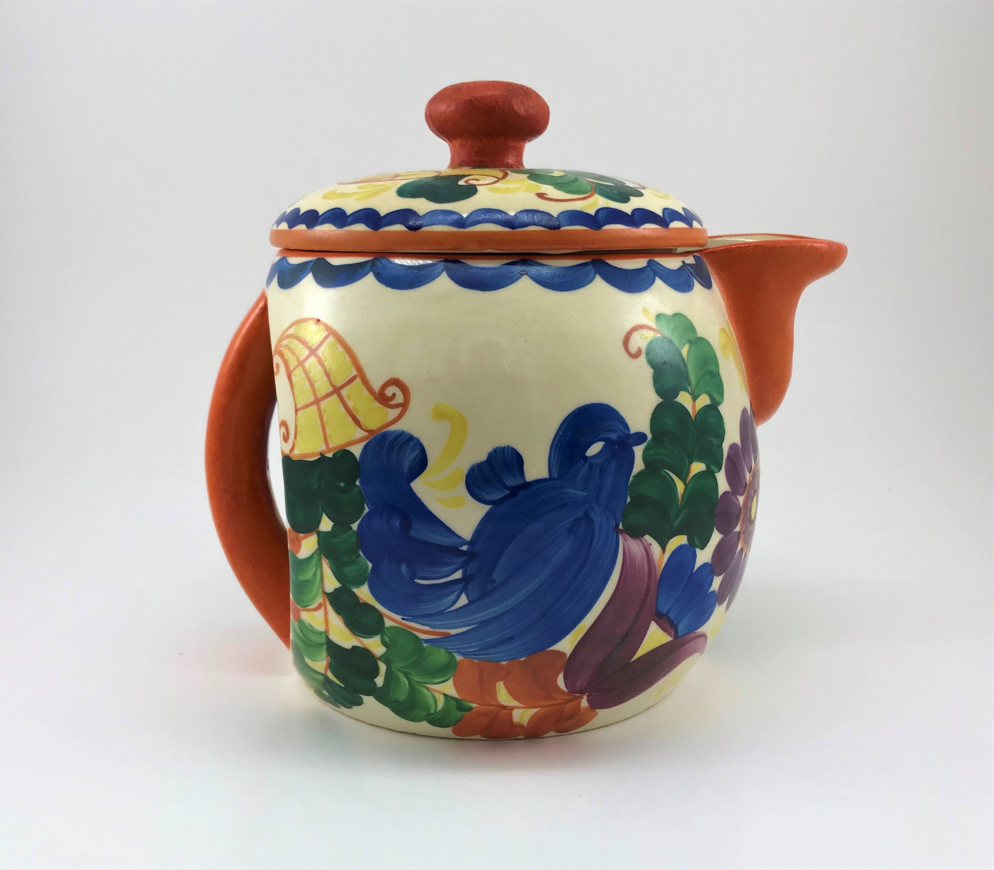 This lovely Joseph Mrazek teapot, featuring his rare bluebird design, was made in Czechoslovakia in the 1920s and imported to the United States by Mrazek's Peasant Art Industries.