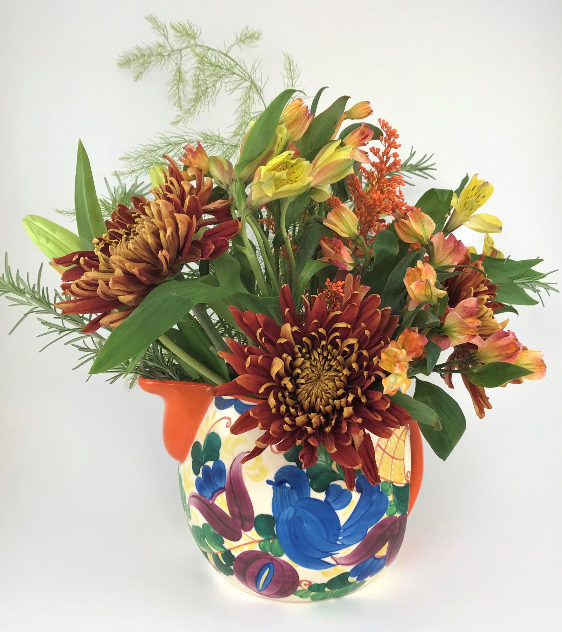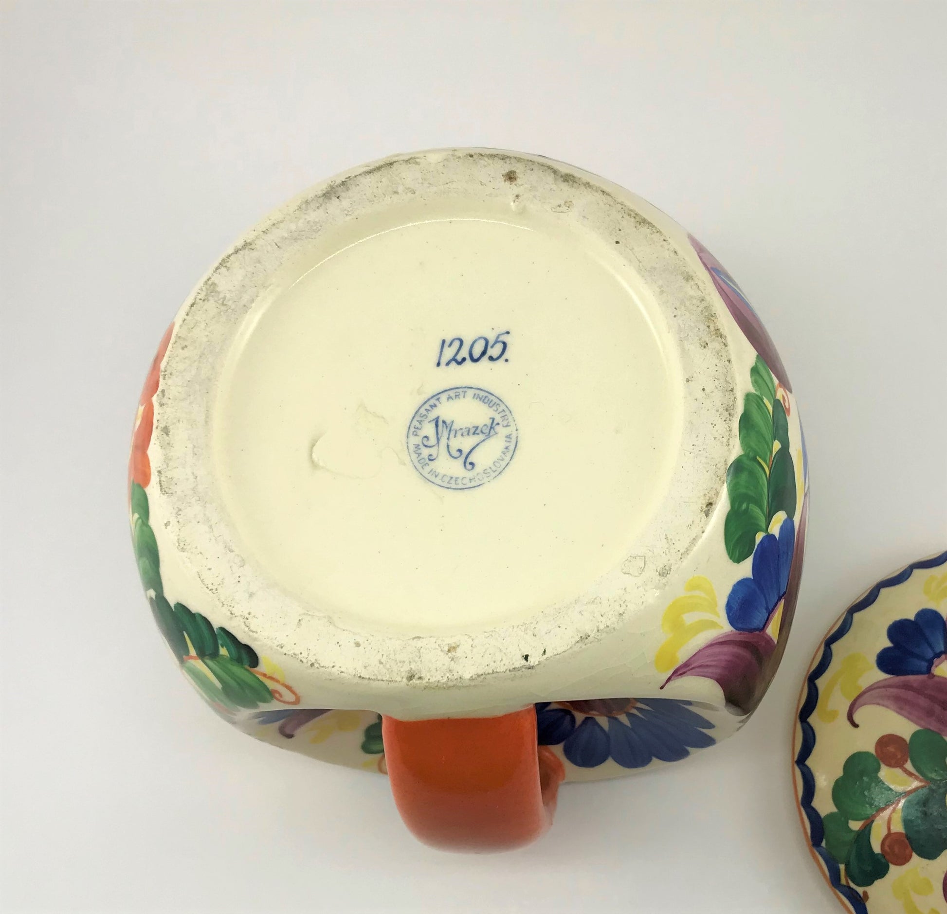 The ceramics designed and produced by Joseph Mrazek and his Peasant Art Industries are steeped in the beautiful artistic traditions of the Slovak and Bohemian people. While Mrazek’s company was in operation only between the World Wars, from 1918 until 1933, the earliest pieces are among the most vibrantly colorful and loveliest, incorporating time-honored adornments such as flowers, hearts, birds, and apples. After immigrating to New York 1908, Mrazek became a decorated hero of the Czechosolvakian independence movement, serving as an American undercover agent during World War I. He founded Peasant Art Industries in his New York City apartment after experimenting with a do-it-yourself ceramics kit purchased at Macy’s. His business grew with the establishment of a factory in Czechoslovakia in the early 1920s from which he imported ceramics hand-painted by local artists in Letovice. In the mid-1920s, Mrazek expanded his artistic vision to include Art Deco designs that endured until the company closed in 1933.