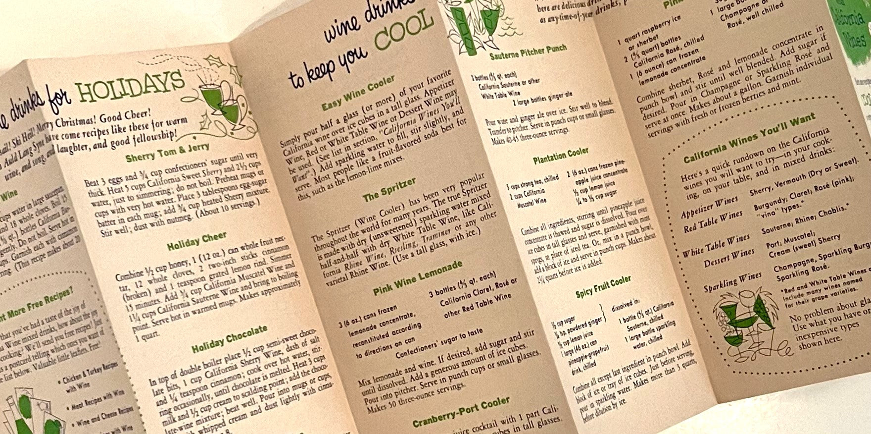 This classically mid-century booklet promotes the use of California wines in recipes for drinks of all kinds - cocktails, punches, eggnogs, coolers, spritzes and more! There is a drink for every season and every occasion as evidenced by the compelling advertising blurb from the Wine Advisory Board on the cover: "Here are recipes for Coolers so refreshing in the summertime...for Party Punch so gay and inexpensive...for Appetizers you can enjoy every day...Wedding Punch for festive occasions, and Hot Wine Drinks for your joyous Holidays!...All made with California Wines..."Always ask for the Wines of California".