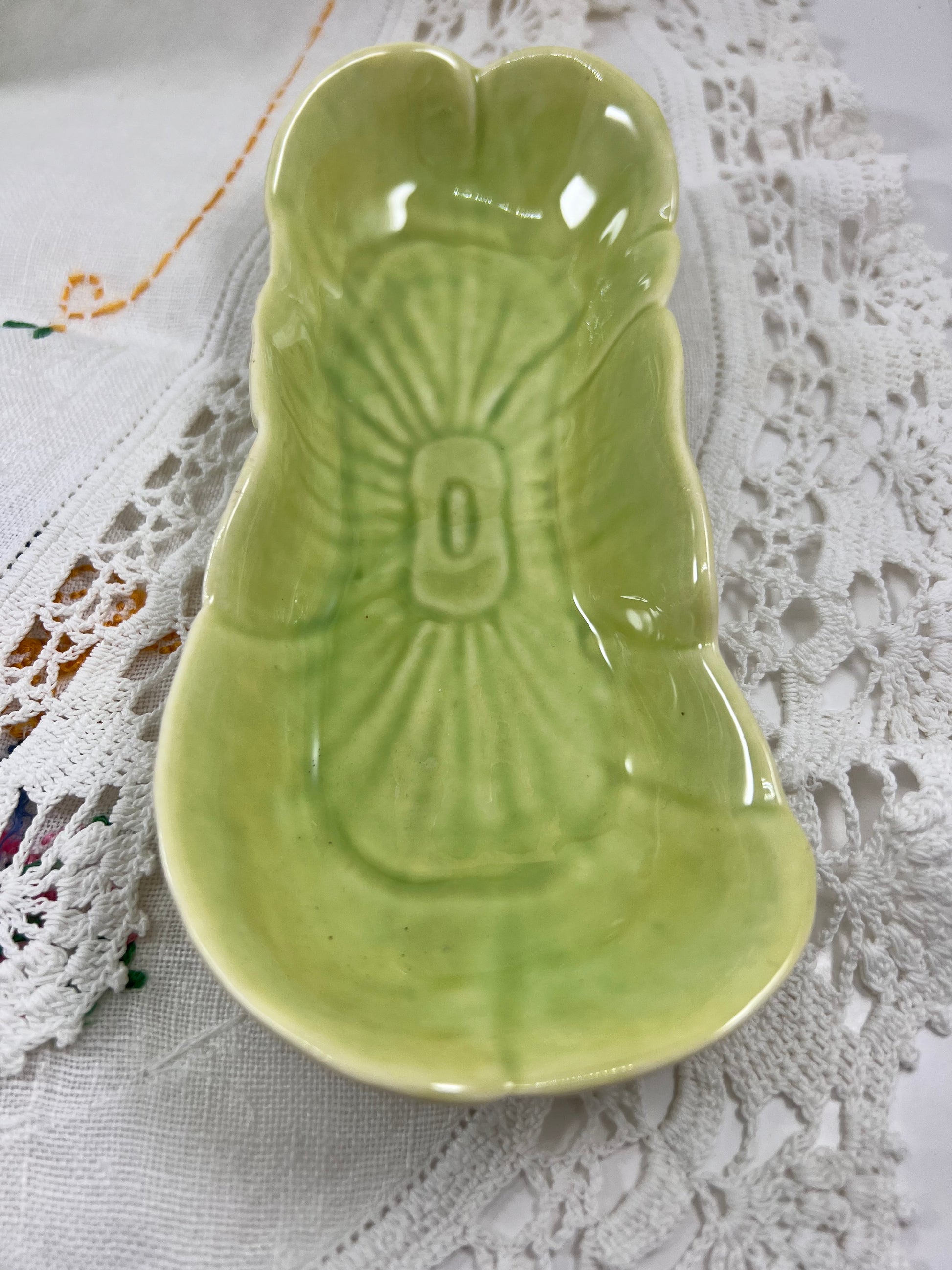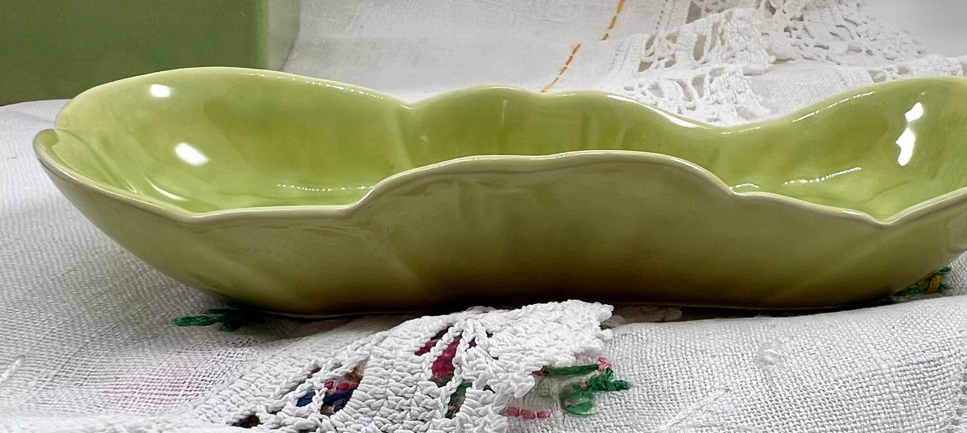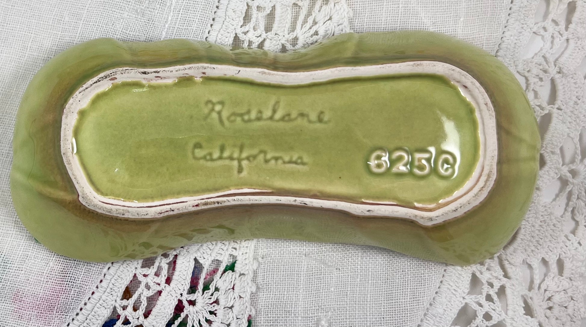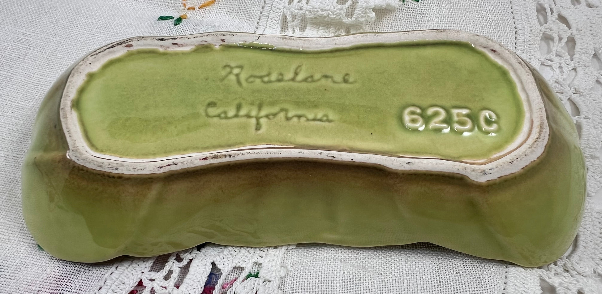 The color is gorgeous and quite evocative of the period. The bottom is incised with "Roselane Pottery" while the raised "625C" indicates the model number. Measuring approximately 7 1/4" long x 3" at its widest point x 1 3/8" tall, this dish could have a multitude of purposes, from candy dish to trinket dish. The perfect addition to any mid-century collection or interior.