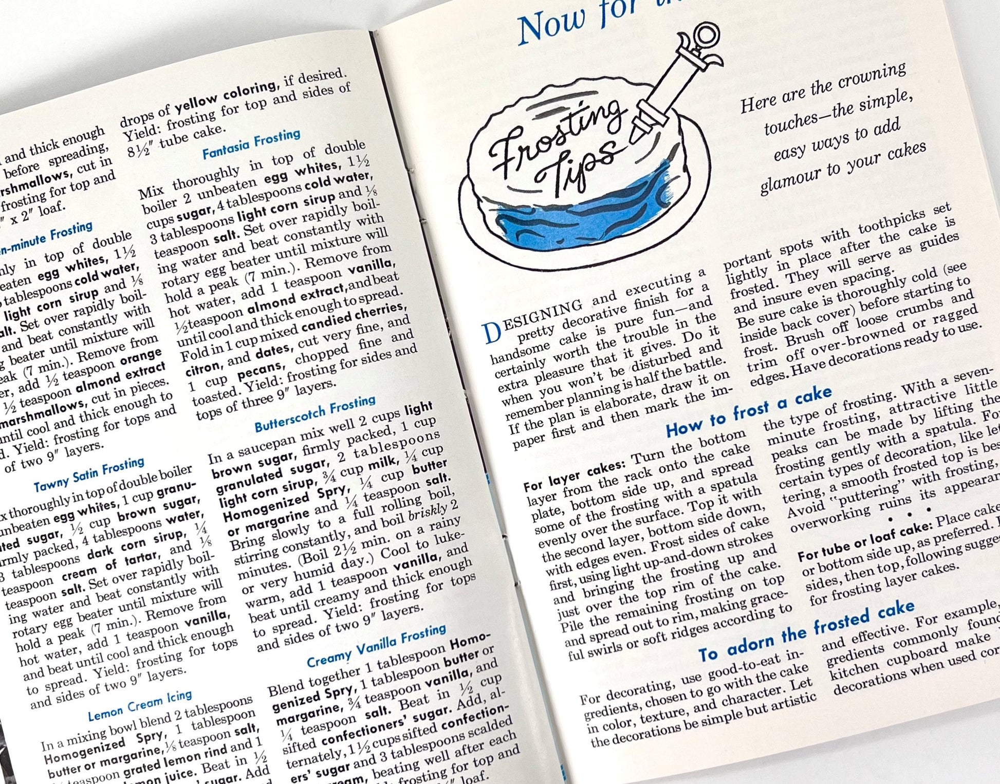 The title of this promotional recipe booklet is the real winner though, and testament to the era. According to "Aunt Jenny", author of the foreword, "they're tested, they're sure-fire and you'll find they make the most delicious cakes any husband could ever ask for." She goes on to ask, "Which one will HE choose? And now you can run your own popularity poll-bake each one of these ten beauties, and see which wins with HIM." Husband or not, running a cake competition with these ten recipes would be great fun for anyone. And, with frosting recipes and decorating tips throughout, this is a really fun little cookbooklet.