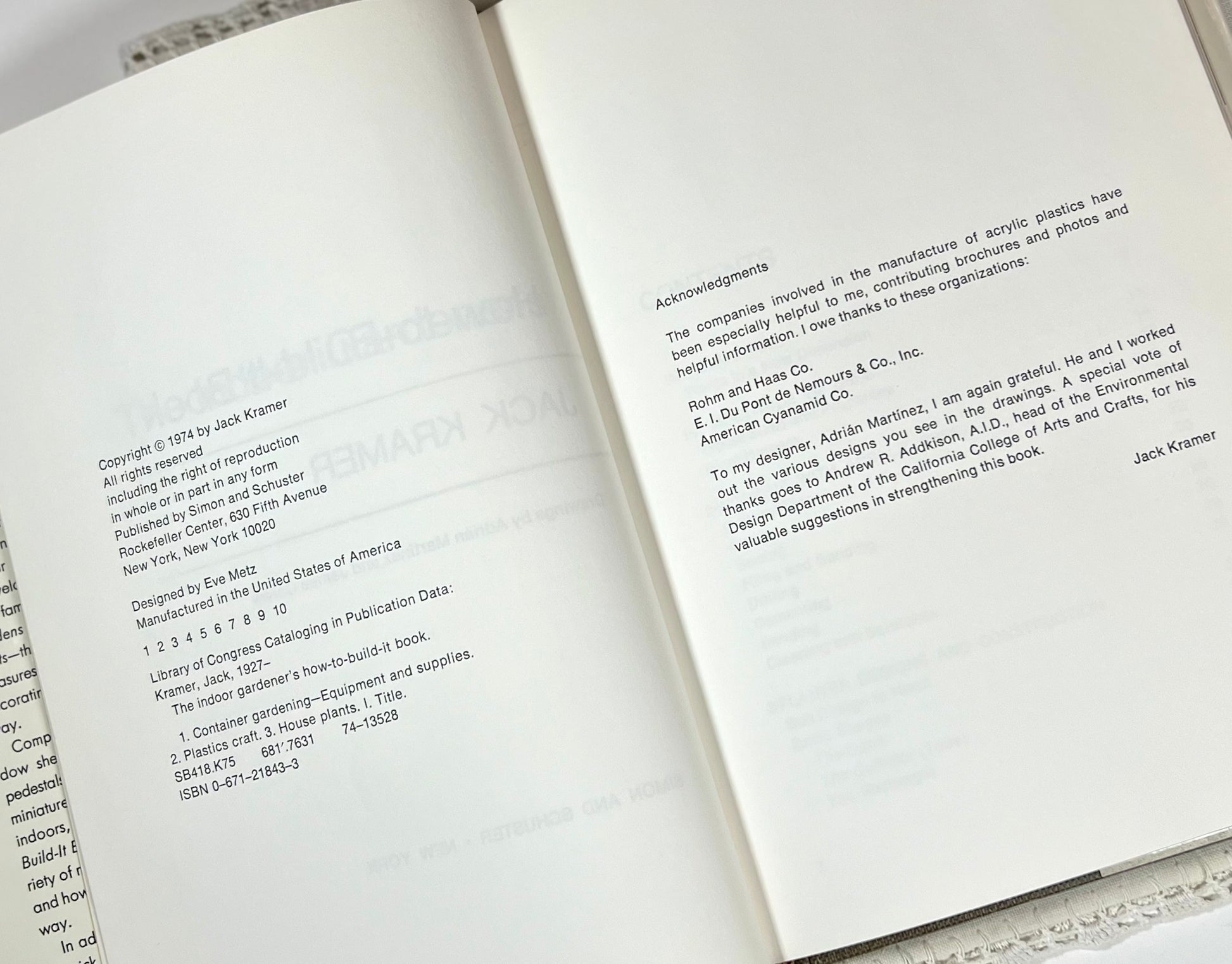 Published in 1974 by Simon and Schuster, this book claims to be the first of its kind to show "you how to build furniture and holders that will show off your plants to their best advantage."