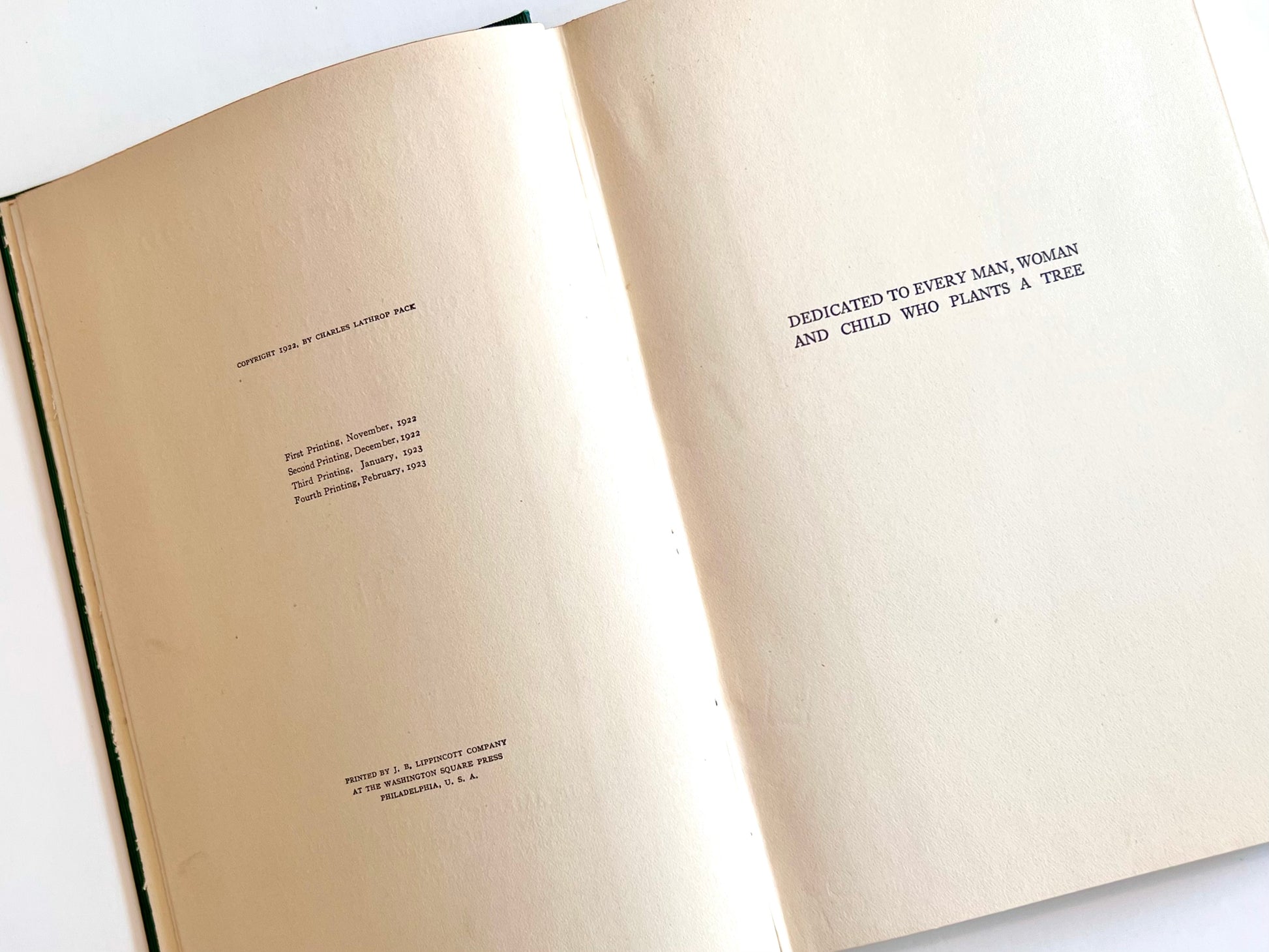 Written by Charles Lathrop Pack and originally published by The American Tree Association in 1922. Hardcover edition in full green cloth binding. Dust jacket is absent. Measuring approximately 6 1/4" x 9 1/4", the book contains 257 pages with photos, black-and-white illustrations, and color plates. Some page discoloration from age and slight page crack between first color plate and title page.