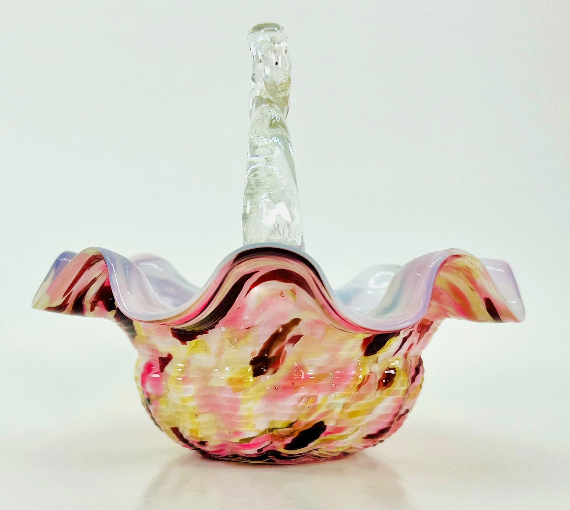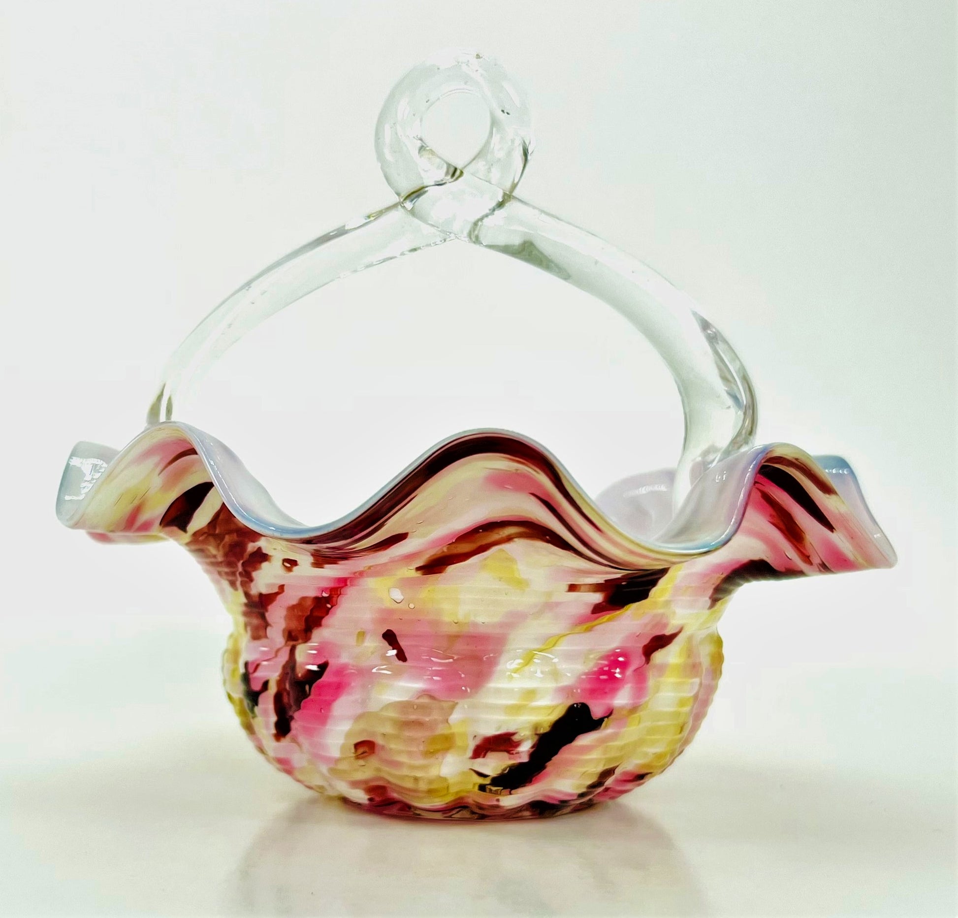 Franz Welz Boehmian Spatter Glass Basket, Pink and Yellow with Ruffled Edge and Looped Handle