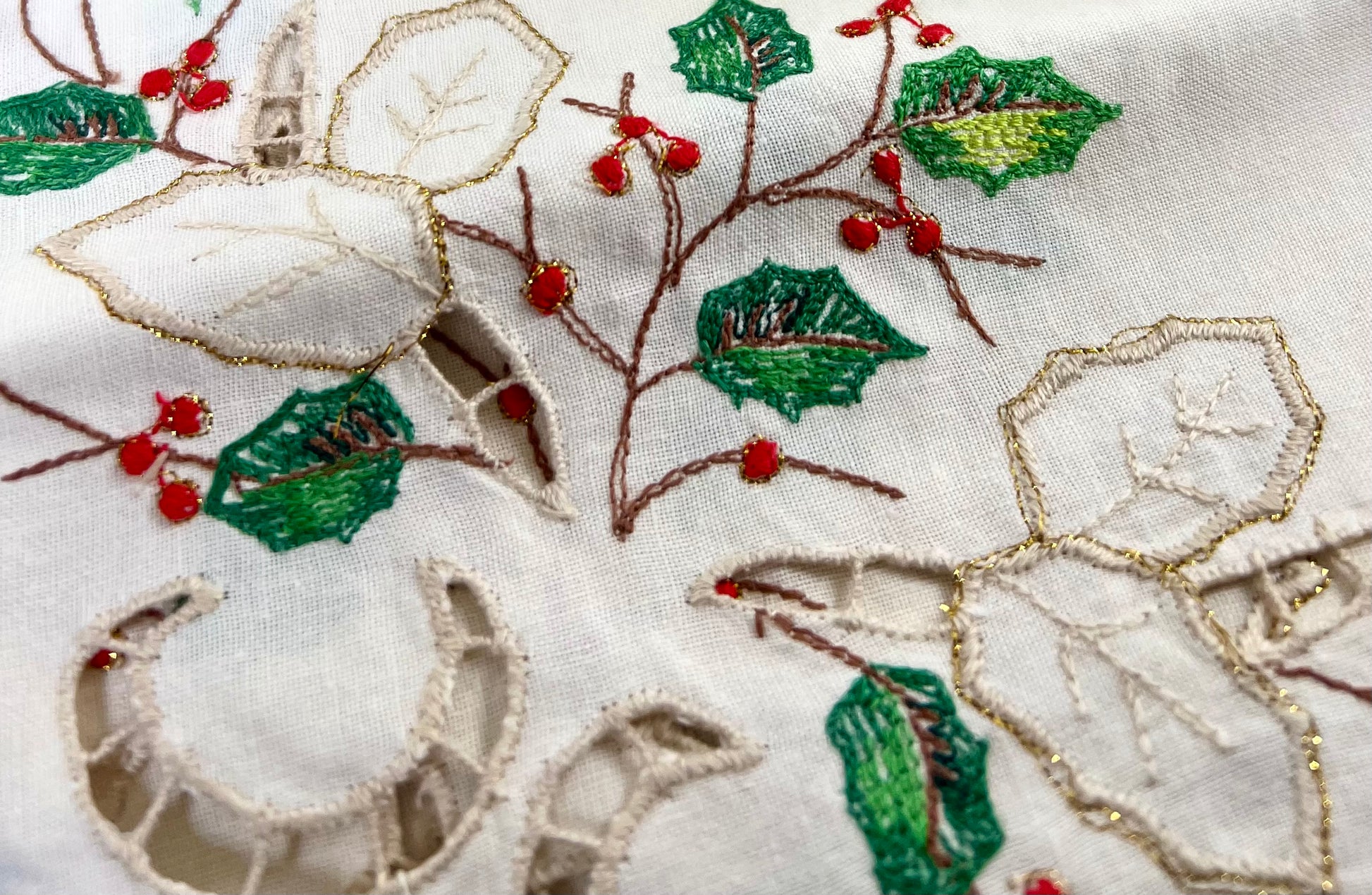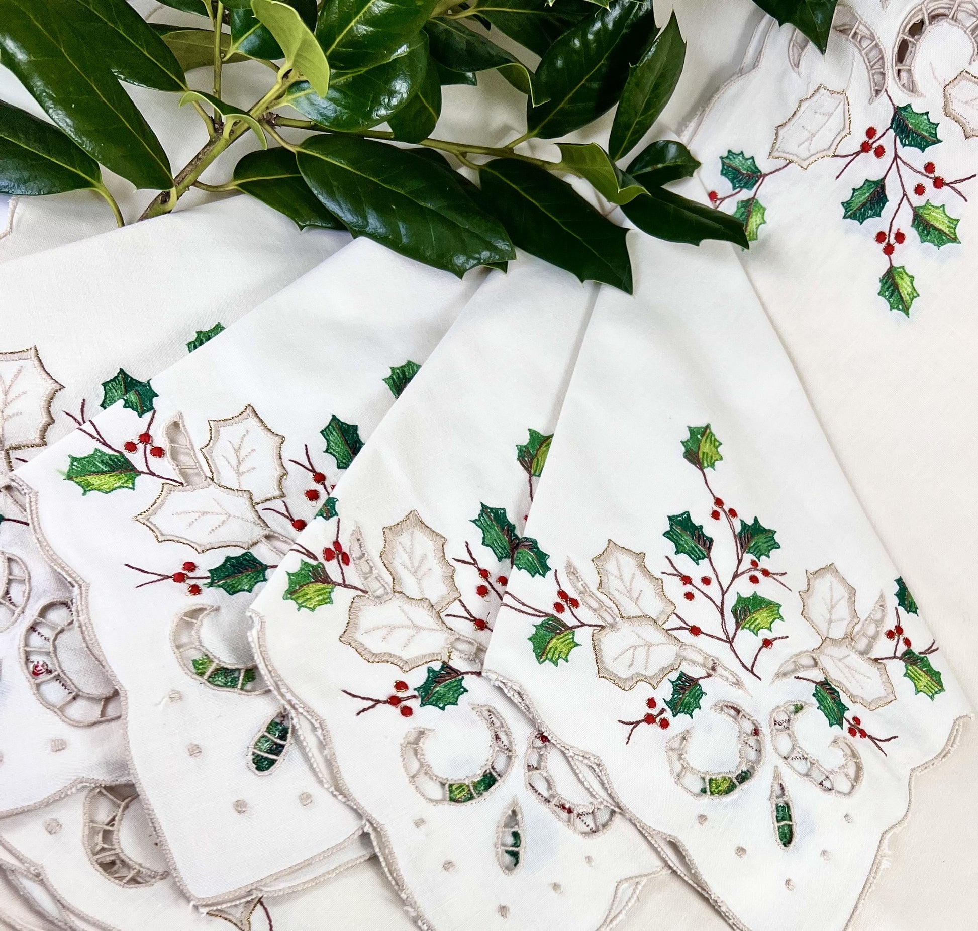 Lovely set of four Lenox holiday embroidered napkins featuring holly and berries with sparkly gold trim and delicate, decorative cut-work.