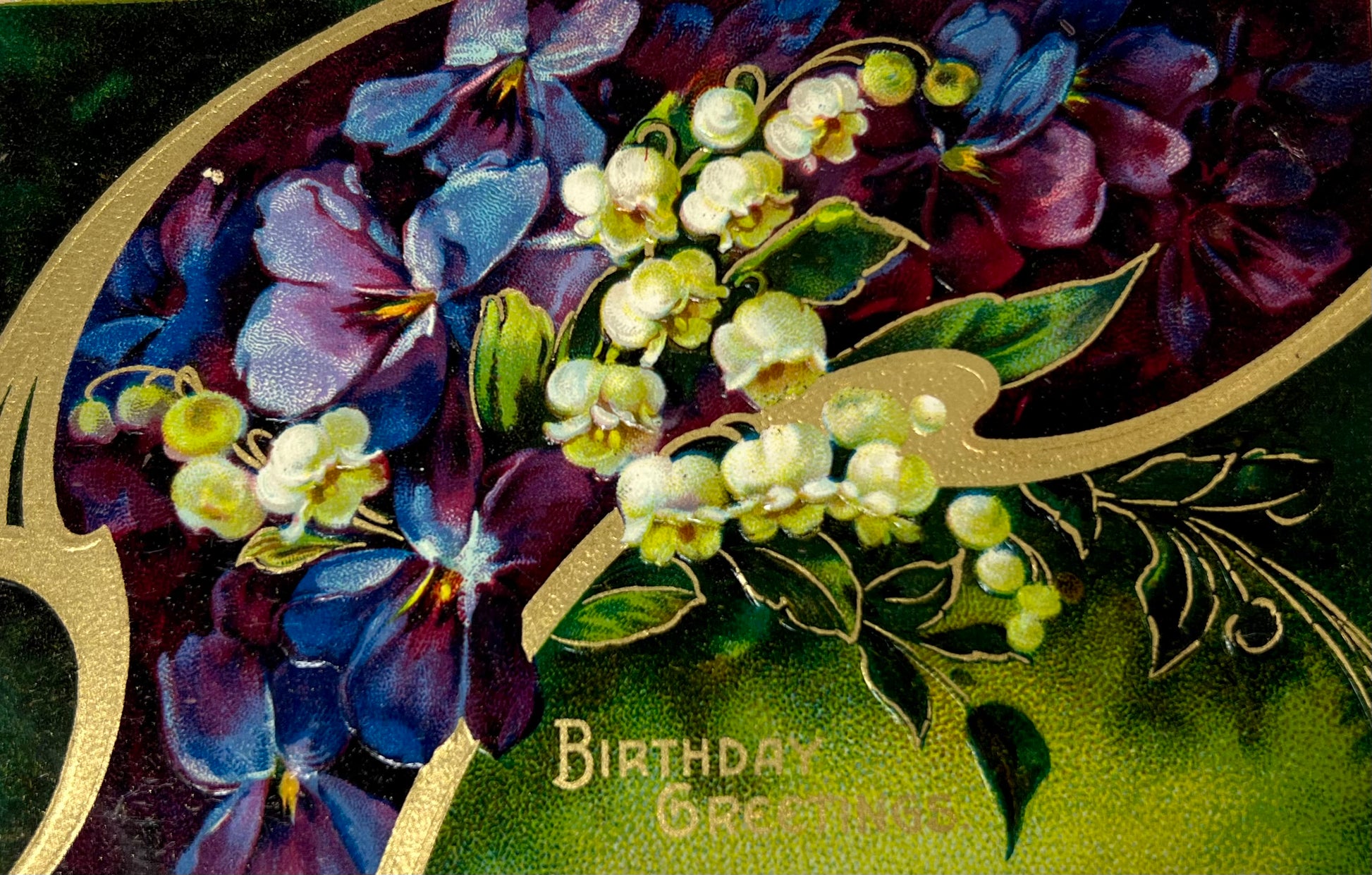 This lovely floral postcard features violets and lilies of the valley with golden birthday greetings.