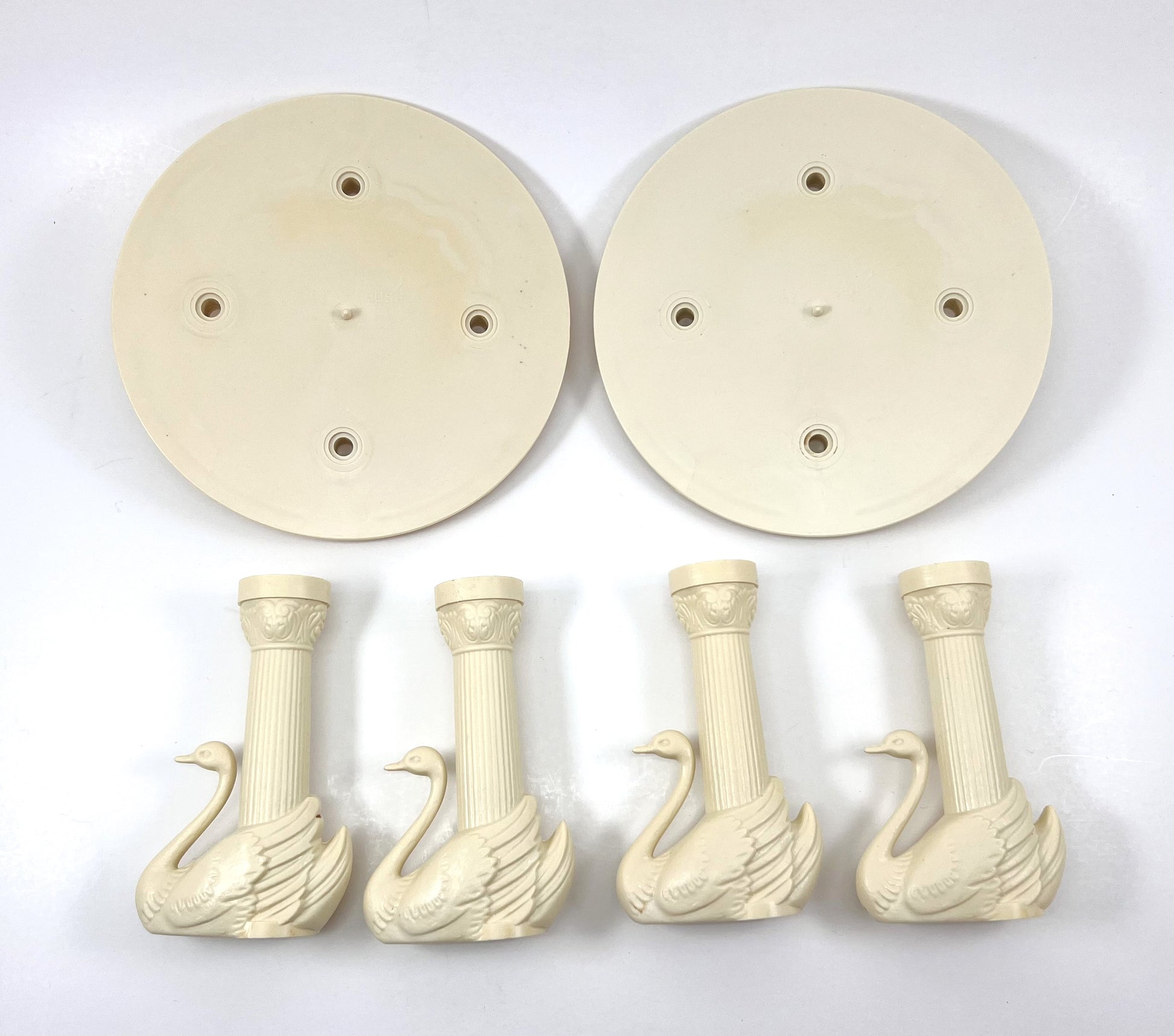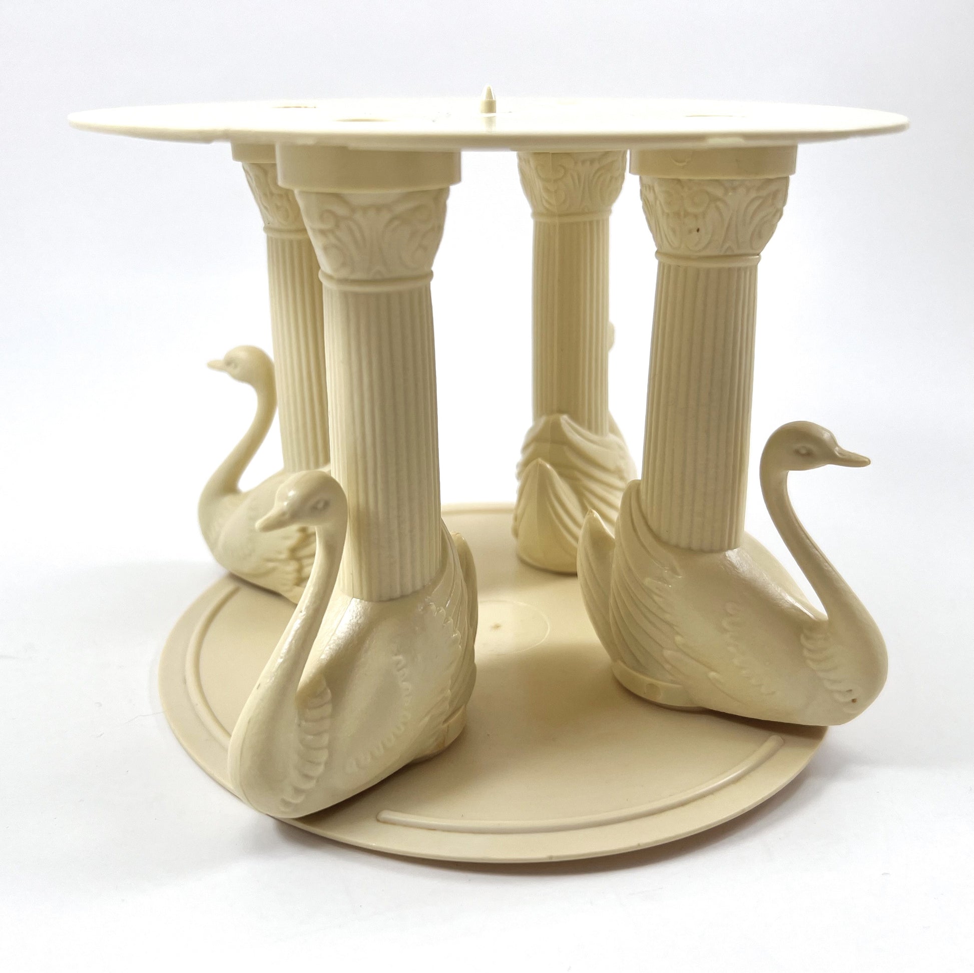 This set features four swans with pillars and two cake support discs. The photo shows one way the set can be assembled, but there may be other ways to be creative with the swans and cake supports. Made of a creamy off-white plastic, each swan measures approximately 4 1/4" tall by 2 1/2" front to back by 1 1/8" wide. The cake holders are approximately 6" in diameter.